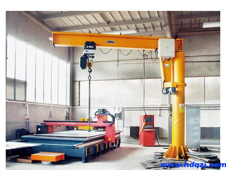 懸臂吊工作強度為輕型,起重機由立柱,回轉臂回轉驅動裝置及電動葫蘆組成,立柱下端通過地腳螺栓固定在混凝土基礎上,由擺線針輪減速裝置來驅動懸臂回轉,電動葫蘆在懸臂工字鋼上作左右直線運行,并起吊重物。起重機懸臂為空心型鋼結構,自重輕,跨度大,起重量大,經濟耐用。內置式行走機構,采用帶滾動軸承的特種工程塑料走輪,摩擦力小,行走輕快;結構尺寸小,特別有利于提高吊鉤行程。
