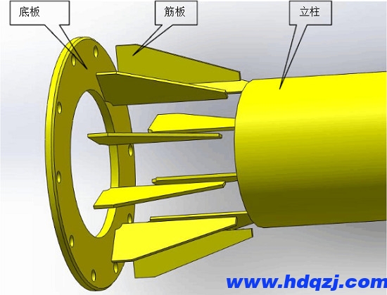將立柱套入底板的內(nèi)圈中,在底板的兩側(cè)將底板與立柱焊接固定,再將若干筋板焊接于底板和立柱上,完成立柱懸臂吊底板安裝。
