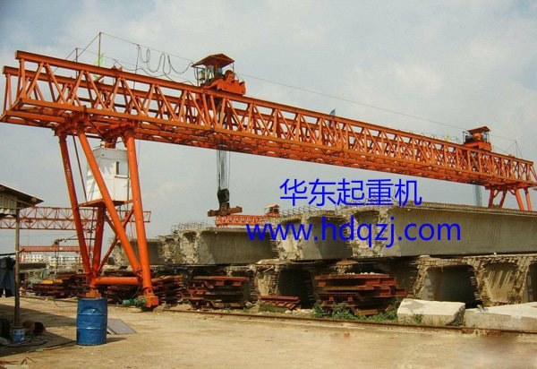 雙吊具提梁機是為一臺設備吊運較大橋梁使用的活動型雙鉤雙吊點提梁機,主要作用是單臺提梁機獨立把大型預制梁從制梁臺吊運到存梁臺位,完成預制梁養護后在單臺提梁機從存梁臺位獨自提吊至運梁車上。