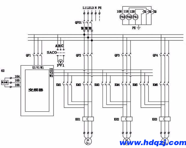 那么變頻器如何實現(xiàn)一拖多的功能?下面僅僅對一次電氣原理圖做出示例。二次電氣原理圖需要根據(jù)控制要求設計,此處暫不贅述。