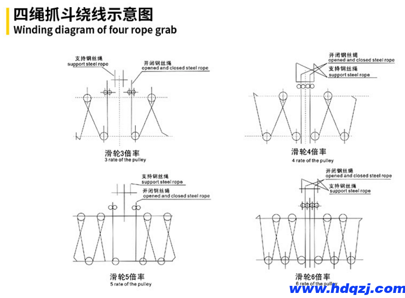 在各類起重機上,配有兩組電機卷筒(即電動葫蘆),每組卷筒引出兩根鋼絲繩,其中兩根組成一組分別生根在抓斗平衡架端作支持用,另一組鋼絲繩經過上橫梁的滑輪與下橫梁的滑輪,組成滑輪組,起開閉斗部作用。