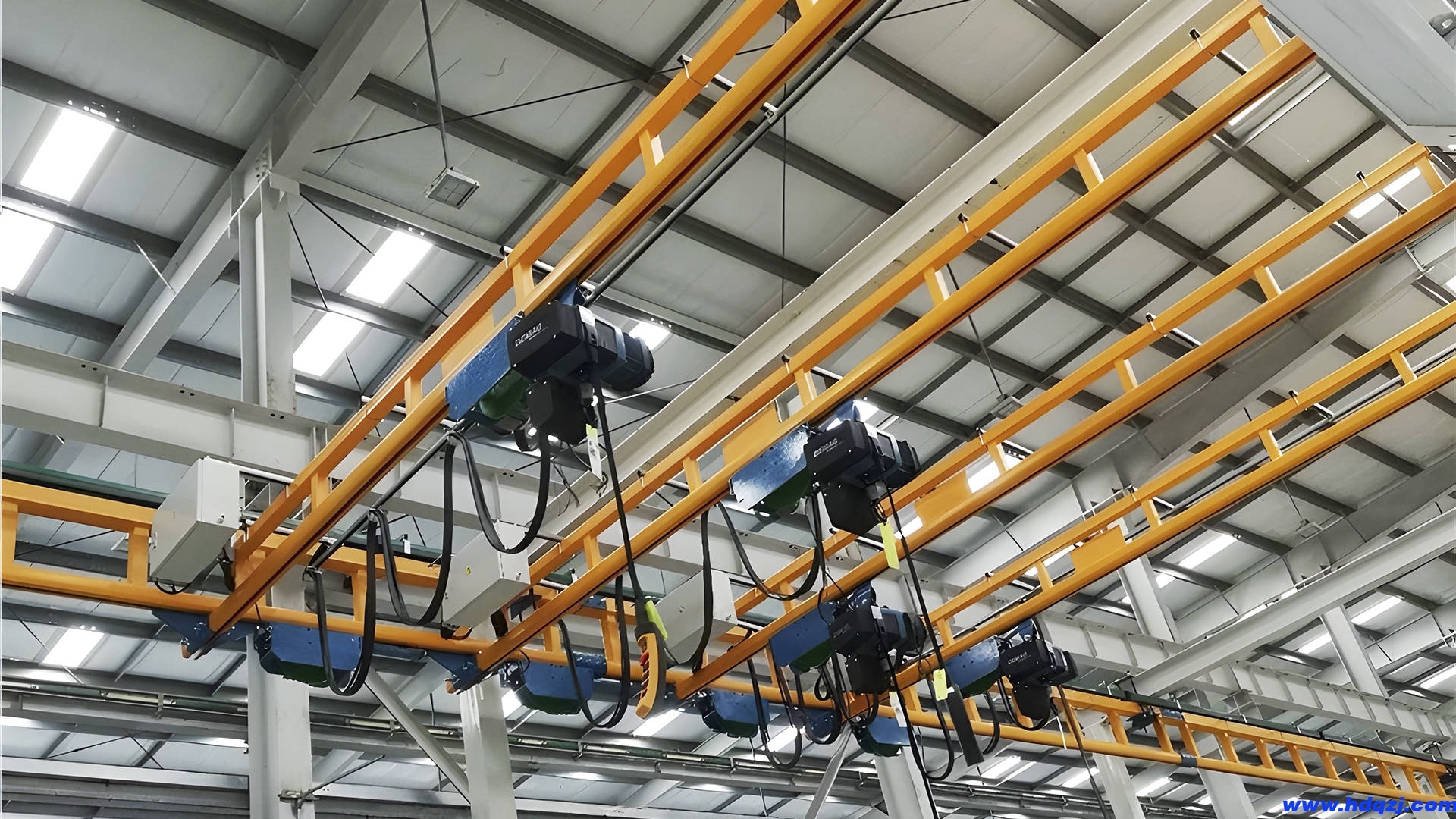 KBK由懸掛裝置、軌道、道岔、行走小車、電動葫蘆、移動供電裝置(滑線)以及控制裝置組合而成,只需懸掛在廠房頂或梁架上便可實現物料的空中直接輸送。